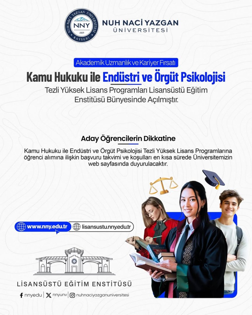 Nuh Naci Yazgan Üniversitesi Lisansüstü Eğitim Enstitüsü bünyesinde Kamu Hukuku ile Endüstri ve Örgüt Psikolojisi Tezli Yüksek Lisans programlarımız açılmıştır. Uzmanlaşmak ve kariyerine değer katmak isteyen tüm adaylarımızı bekliyoruz. Başvuru takvimi ve koşulları çok yakında web sitemizde ilan edilecektir. Takipte kalın!
